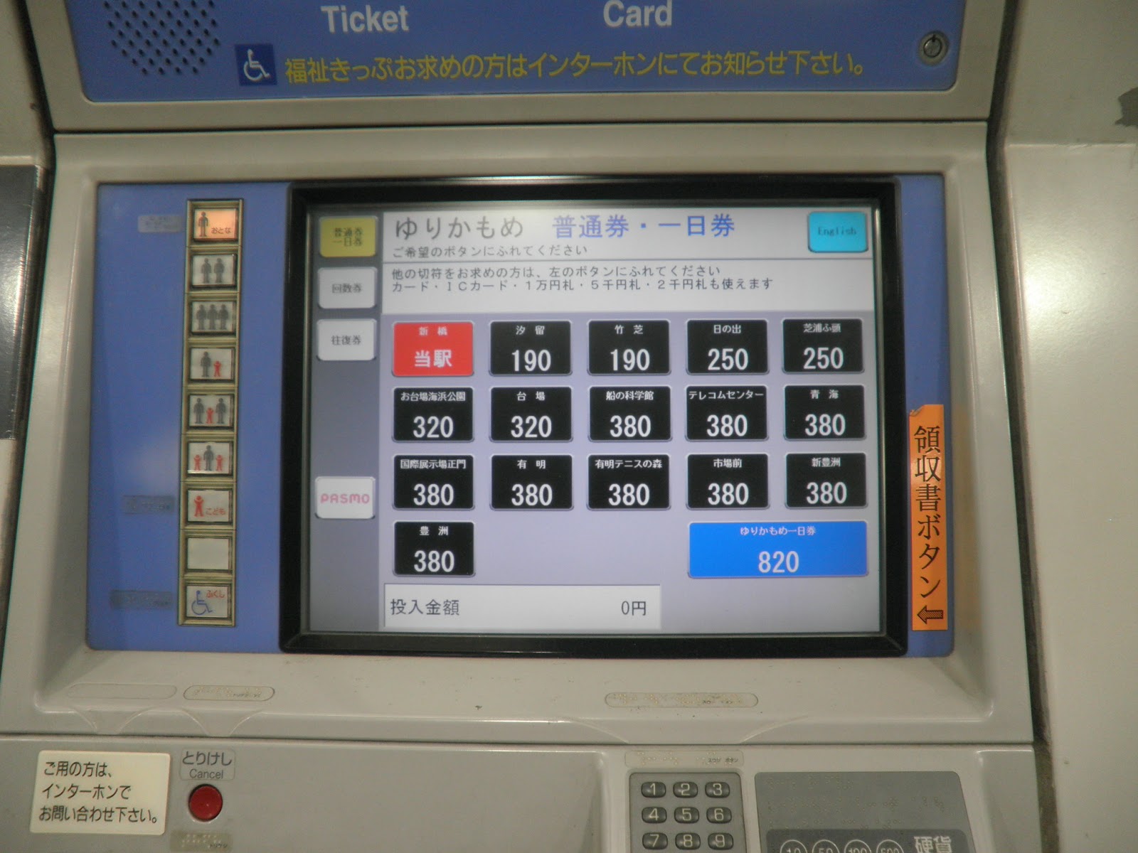 本來我們以為東京單軌電車(Monorail)和JR系統不同,所以我們應該在這裡先買一張日幣490元到濱松町的車票,然後等到了濱松町站要換搭JR山手線時,再去JR的濱松町站購票機購買一張日幣140元到新橋的JR車票。