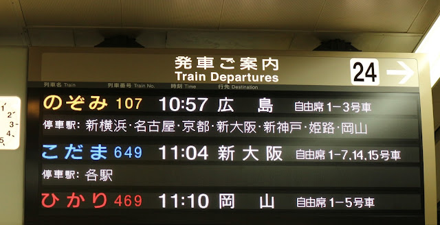使用JR PASS 是不能搭乘NOZOMI(上面看板中黃色字體的車班)新幹線,HIKARI(紅色字)和KODOMA(藍色字)都可以搭乘。